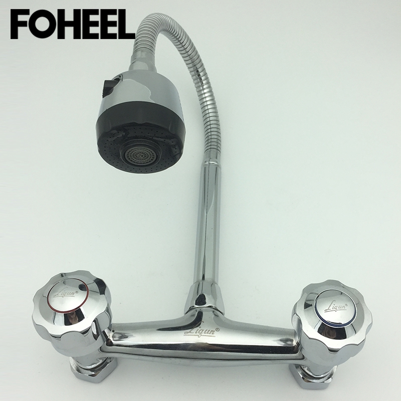 Foheel Wall Mounted Kitchen Sink Faucet Kitchen Hot And Cold Tap Double Hole Mixing Valve Pull Out Robinet Cuisine